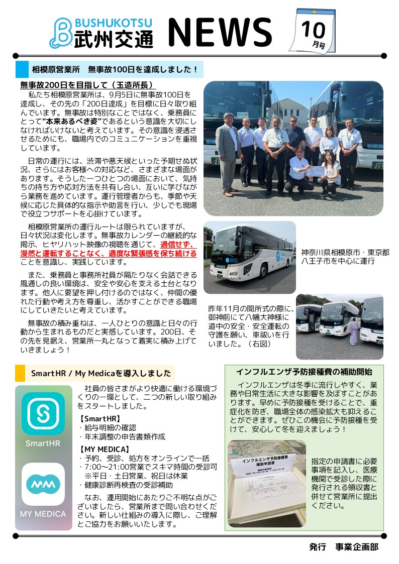 今回は、相模原営業所が無事故100日を達成、快適な環境づくりに関する新たな取り組みをレポートしました。 武州交通では、社員一人ひとりが安心して働ける職場づくりを目指し、日々の取り組みを「武州NEWS」を通じて発信しています。営業所の工夫や社内イベント、安全対策など、現場のリアルな様子をぜひご覧ください。