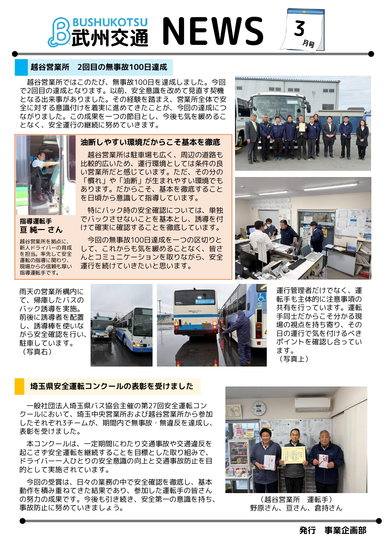 今回は、越谷営業所の無事故達成と埼玉県安全運転コンクールでの表彰をレポートしました。 武州交通では、社員一人ひとりが安心して働ける職場づくりを目指し、日々の取り組みを「武州NEWS」を通じて発信しています。営業所の工夫や社内イベント、安全対策など、現場のリアルな様子をぜひご覧ください。